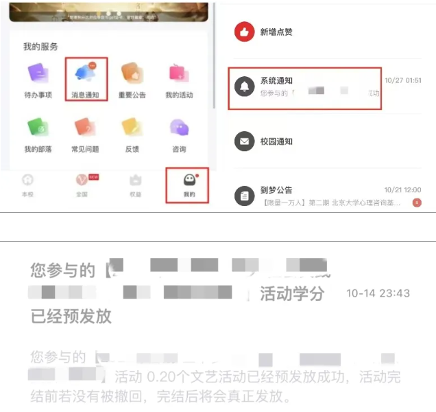 2.如若学生已进行活动报名、实际参与、成功签到且未被管理员签退、在活动结束之后收到学分预发放通知(可在到梦空间→我的页面→消息通知进行确认)待活动被活动负责人正式完结时学分会成功到账。
