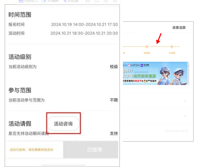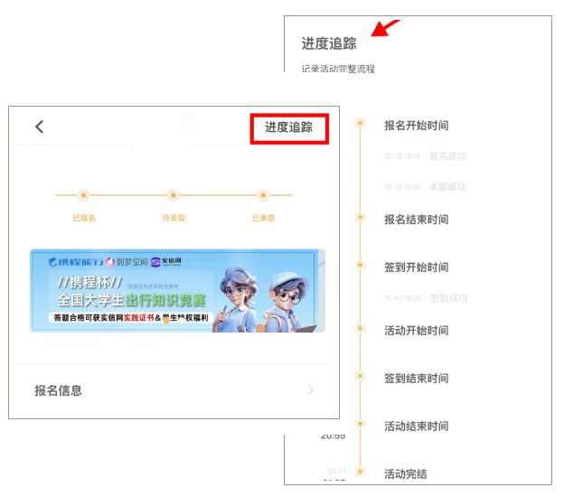可在参与活动的活动详情页中,点击“报名详情-进度跟踪”,即可查看活动完整流程,例如活动报名时间、活动签到时间、活动是否成功签到等。
