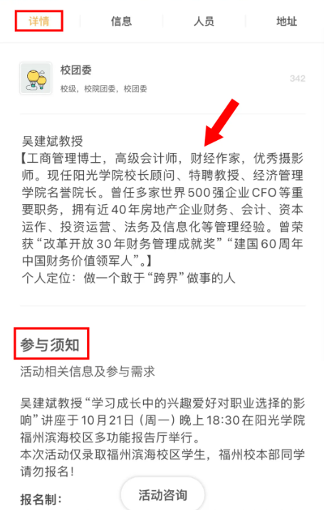 点开某一活动即可进入活动主页,可查看活动详细信息,包含: