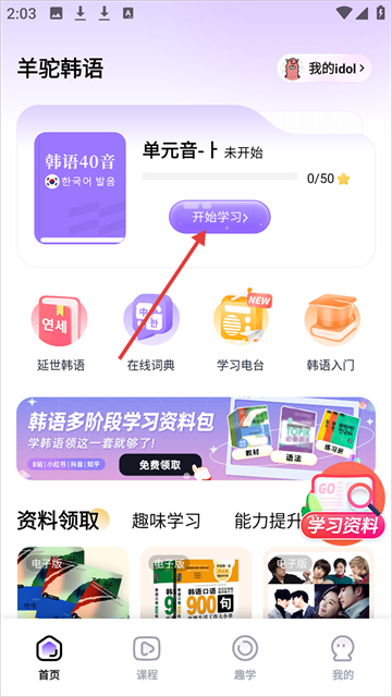 5. 课程多样,有详尽的基础韩语发音教学,有趣的场景课程闯关,标准的歌曲正音学习,还有进阶的等级考试课程,满足不同阶段学习需求。