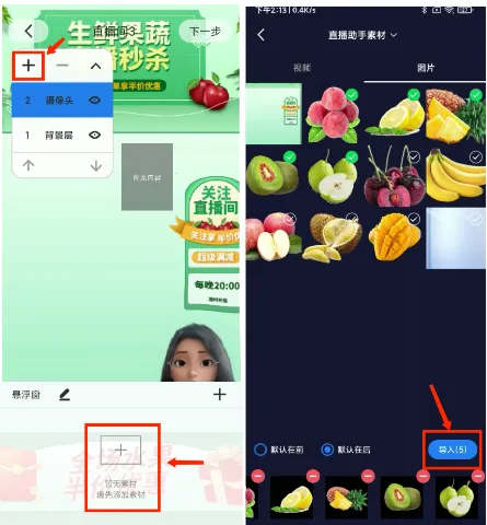 2、点击【背景层】,导入直播间背景图片/视频