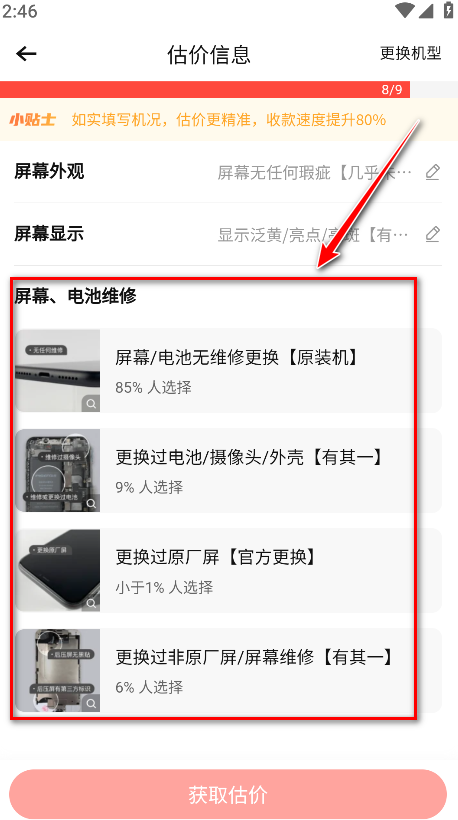 13.选择屏幕电池维修。