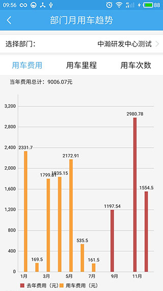 3、在这里可查看部门月用车的趋势,以及车费、里程、此等等。