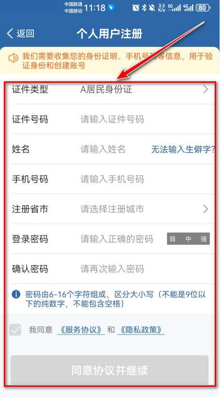 7.按照要求输入正确的信息,勾选我同意《服务协议》和《隐私政策》,再点击同意协议并继续即可重新注册。