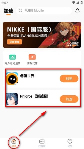 3.登录成功后,就可以开始使用了,点击左下角的“加速”,这里显示的就是手机中已经安装的游戏;