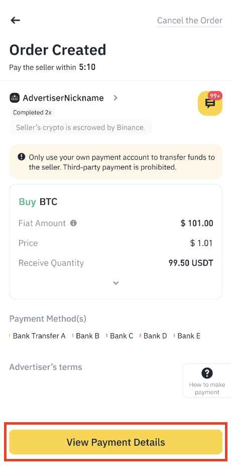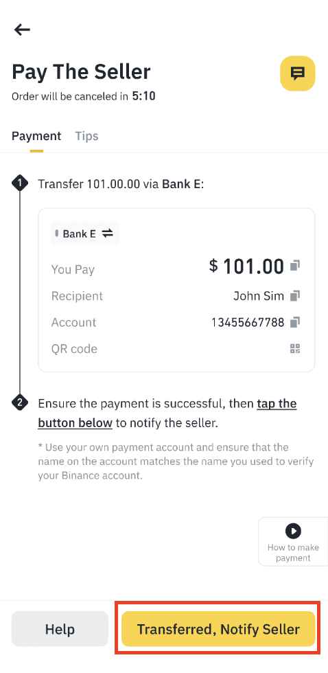 付款流程完成後,选择 [已付款,通知卖方]。订单状态将变更为 [放行中]。请等待卖方确认您的离线付款。他们将在验证您的付款後放行加密货币。然後,您可以在资金帐户中找到购买的加密货币。