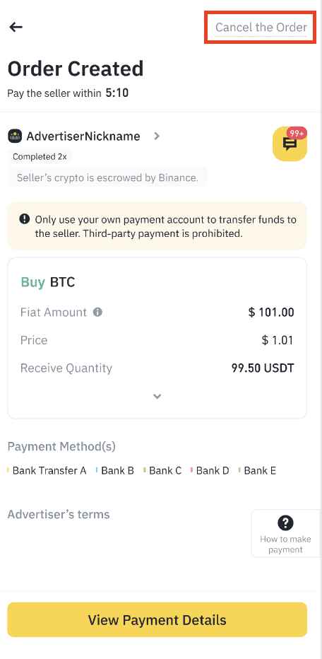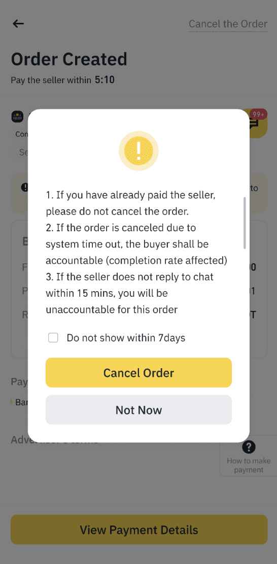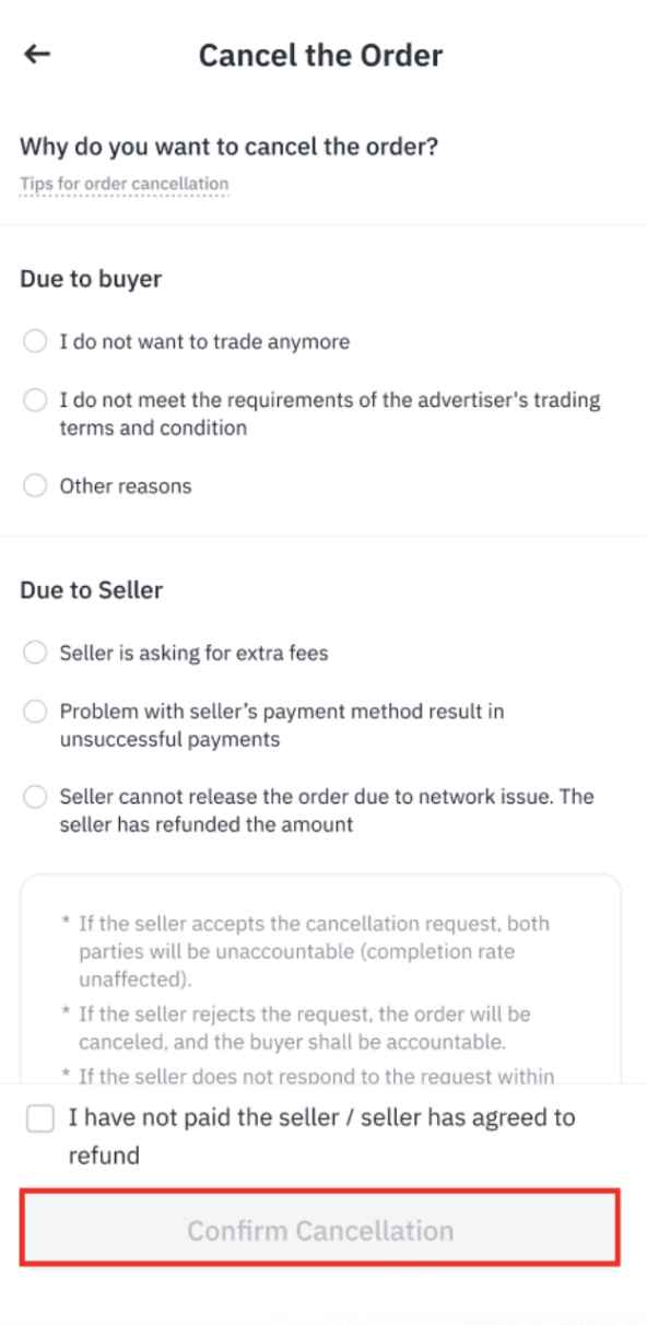 欲在订单成交前取消订单,请点击 [取消订单]。选择取消原因,然後点击 [确认取消]。请注意,如果您一天取消三笔订单,则将於当天暂时停用您的买币功能。