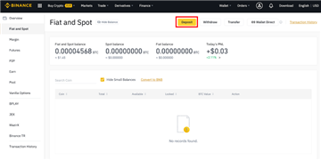 1,登录个人币安账户。登录成功后,将鼠标移至[钱包],点击[法币和现货]。