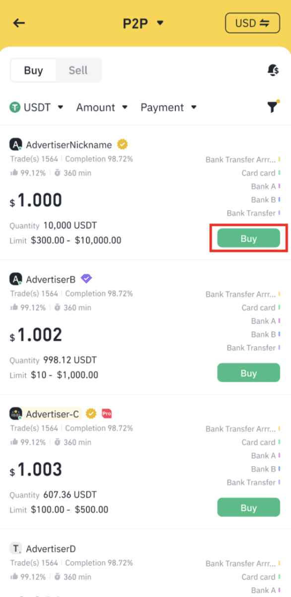 1. 选择您想要向其购买的卖方。您可以按交易金额和付款方式进行筛选。点击 [购买]。