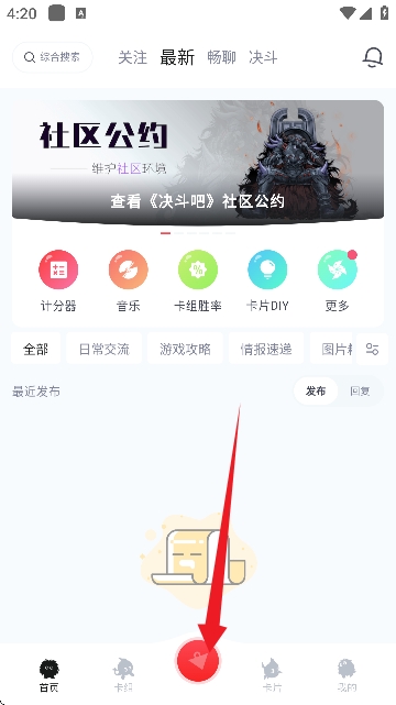 1、打开决斗吧APP,点击底部中间的“+”按钮。