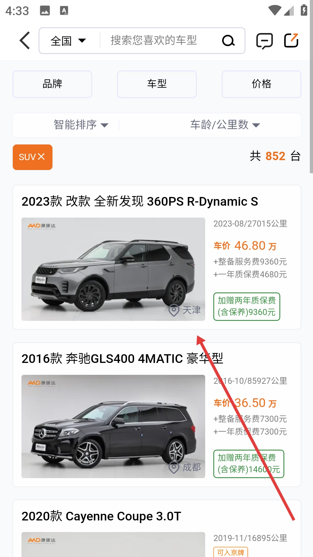 4、从筛选后的结果里挑选出目标SUV车型,查看该车辆的详细信息,从而完成看车与选车的操作。