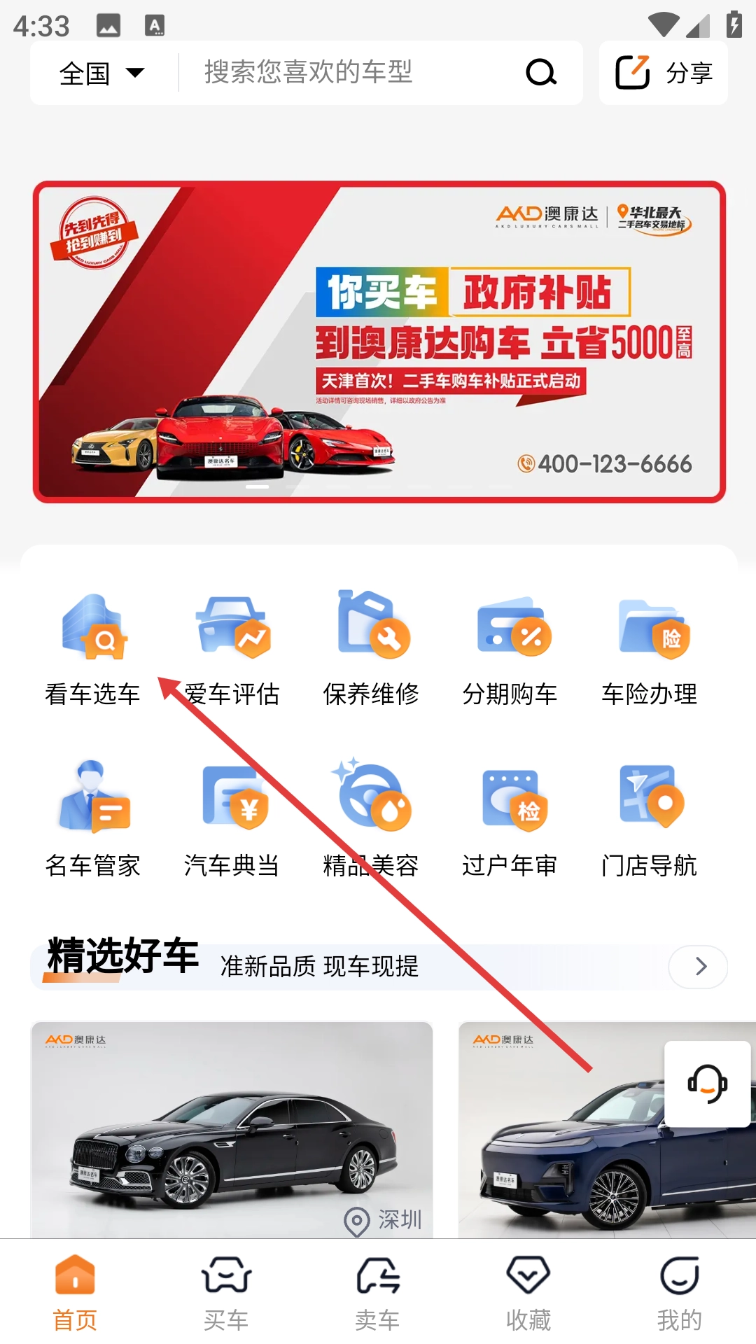 1、点击【看车选车】选项,进入选车页面。