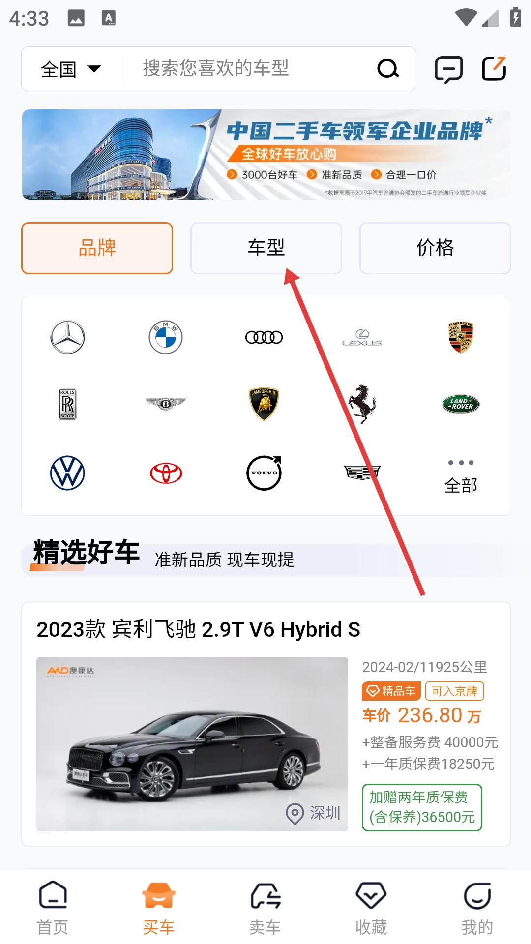 2、在选车页面找到并点击【车型】选项,即可进入车型选择页面。
