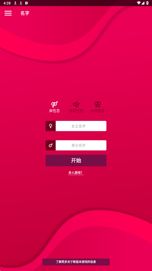 1、启动手机上的couplegame应用,首先设定玩家的性取向,随后输入情侣双方的昵称。