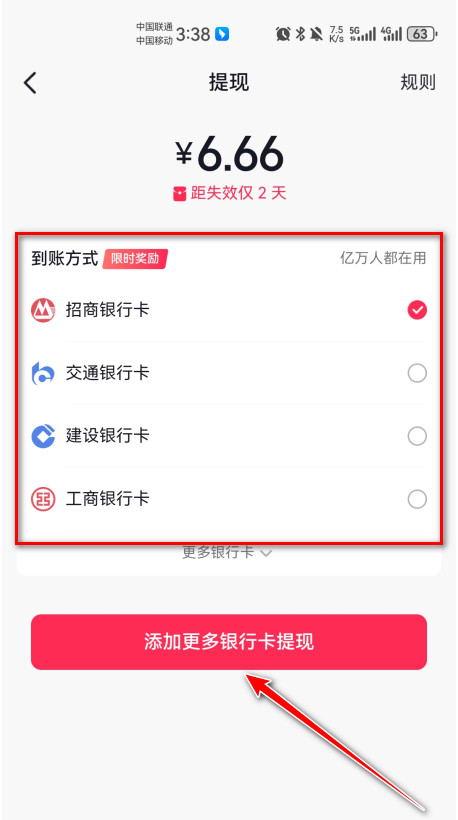 5.勾选自己想要提现的银行卡,然后再点击添加更多银行卡提现。