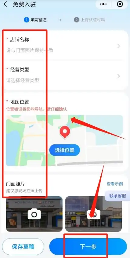 4.进入免费入驻,输入店铺名称.经营类型.地图位置.门脸照片,点击“下一步”。