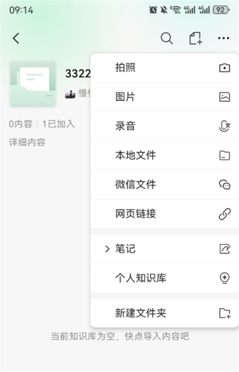 4.点击进入我的知识库点击右上角的+号,支持网页链接、本地文件多种方式添加知识库内容。