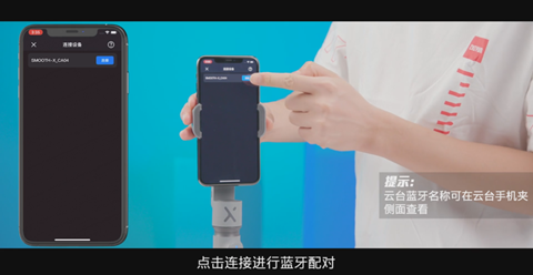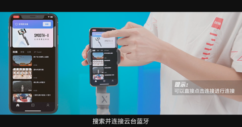 4、手机打开ZY Cami APP,点击左上角相机图标,搜索并连接云台蓝牙,点击连接进行蓝牙配对,手机将提示激活信息。根据APP提示,注册并登陆ZY Cami账号。登陆成功后,点击激活。云台将自动进行激活。激活后,点击完成。即可开始使用SMOOTH-X。