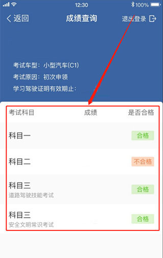 5.登录之后,会跳转到成绩页面,显示以往考试记录的成绩。