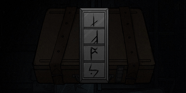2、点击平躺的镜子获得(符文1)——根据KILL的方向和镜像关系分辨正确符文写法。捡起立着的镜子上的【破布条】擦掉皮箱上的灰尘,获得(符文2)——根据HUNTER分辨方向。立着的镜子上获得(符文3)。地面上获得(符文4)。用(符文1234)的上下关系解开皮箱密码,获得【门把手】【榔头】如图。