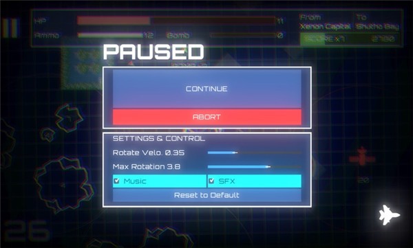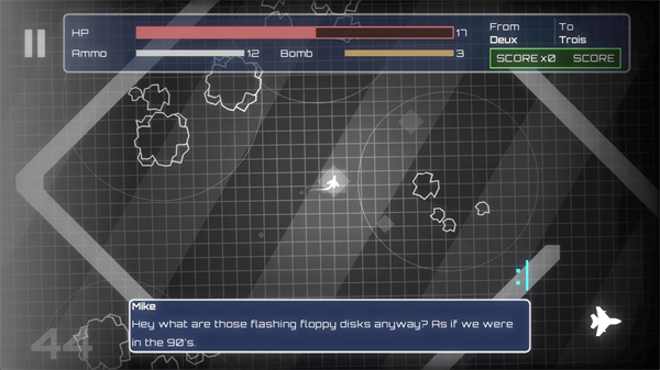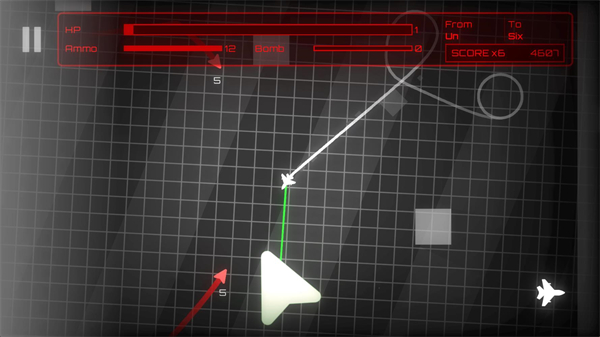 4、正式开始后点击左右屏幕可以控制飞行的方向,同时按住两边的屏幕可以发射子弹摧毁敌人和障碍物。屏幕上方的HP是血量,Ammo是弹药,Bomb是炸弹数量。