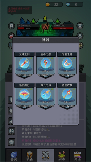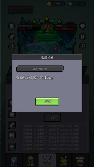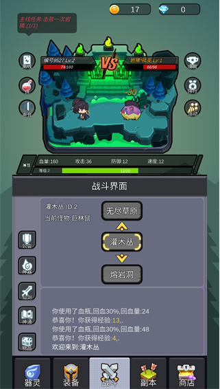 4、正中央式是战斗界面,显示玩家即将面对的怪物和当前所在的地点,下面文字是玩家所获得的奖励,可以前往副本升级打怪。