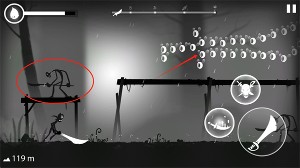 3、点击屏幕任意位置可以进行跳跃,再次点击会进行二段跳,而屏幕右边则是攻击键和技能键,