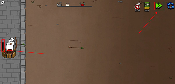 1、进入关卡后,游戏角色会自动发射弓箭攻击,攻击敌人会积攒怒气,满格后可以提高攻速,玩家也有点击右上角的绿色加速按钮加快游戏速度。
