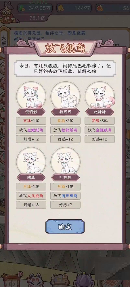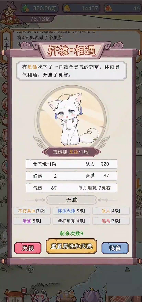 二、完成不同事件后,狐狸将获得对应的属性提升,例如灵力、心境、机缘等。玩家可根据每只狐狸的培养方向,有选择地参与事件,实现差异化成长。