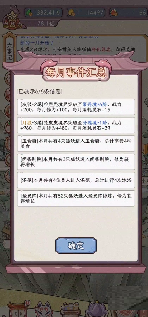 三、游戏会以“月度”为单位,自动记录期间发生的重要事件与狐狸的成长轨迹。玩家可随时在日志中回顾历程,感受时光流转与角色变迁。