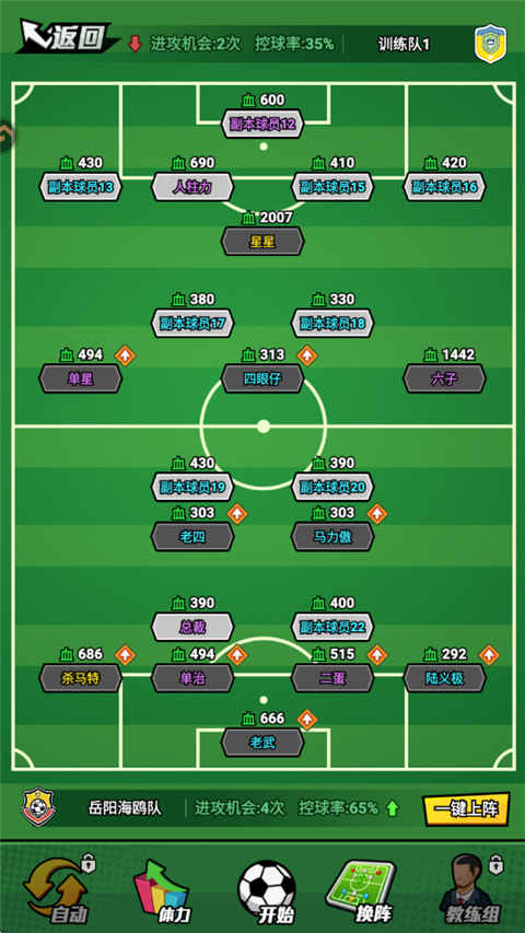 1、进入训练关卡时可以调整阵容,点击开球即可比赛。