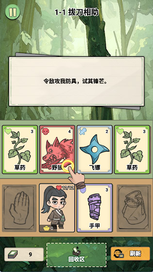 3、使用手甲可以主动防御抵消伤害,消耗上方的卡牌