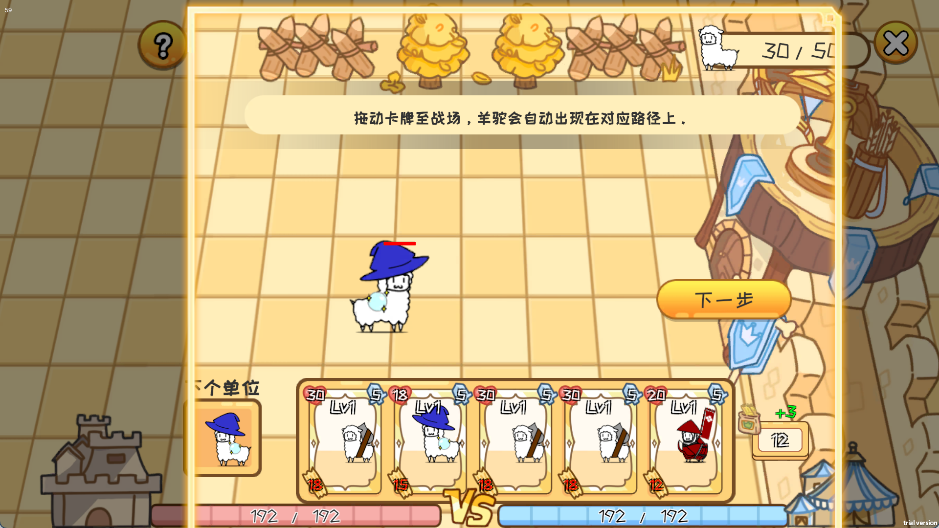 2、拖动卡牌到战场上抵御对方羊驼、进攻敌方防御塔