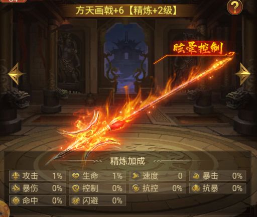 5.方天画戟:吕布的专属战戟,戟尖如画,威震天下。它不仅能对3名敌将造成伤害,更有一定概率使目标陷入“昏迷”状态2回合(昏迷效果无视抗控)。方天画戟一出,敌人瞬间失去反抗之力。