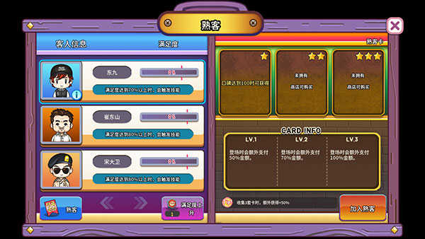 4、特色熟客互动系统:邂逅多位性格迥异的常客,每位角色都配备专属技能与背景故事,通过建立良好互动关系、妥善管理熟客档案,解锁专属经营加成,助力生意持续蒸蒸日上。