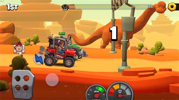 5、低门槛高上限玩法:操作仅需两个按键(油门/刹车),新手易上手;但高阶玩家可通过精准控速、空中姿态调整与道具时机把握实现技术碾压,兼具休闲与硬核属性。
