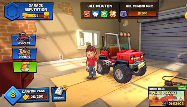 3、角色个性拓展:除经典主角比尔·牛顿外,新增来自《爬坡峡谷》的多位车手,如擅长空翻的尼基塔和装备助推器的瑞克·艾斯,每位角色具备专属特质影响驾驶表现。