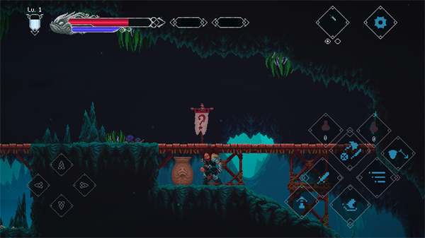 3、左屏控制移动,右屏完成跳跃、挥砍等操作,右上方可切换武器;