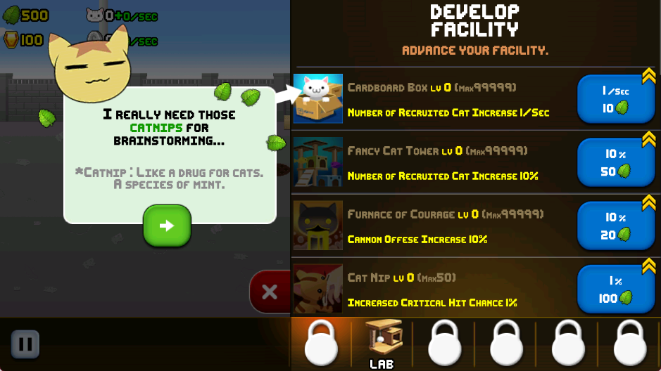 2、闲置科技文明:游戏设定在一个融合了蒸汽朋克与像素美学的架空世界,猫咪们通过收集资源不断升级武器与防御系统。