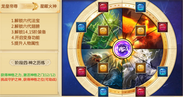 4、神之历练:使用四种钥匙(击杀500级以上BOSS掉落/商店购买/使用元宝代替)或者经验(巅峰230级以上经验)激活对应的神格,全部激活后点击“挑战”开启封神副本挑战,胜利并且等级在巅峰250以上即可完成转职。