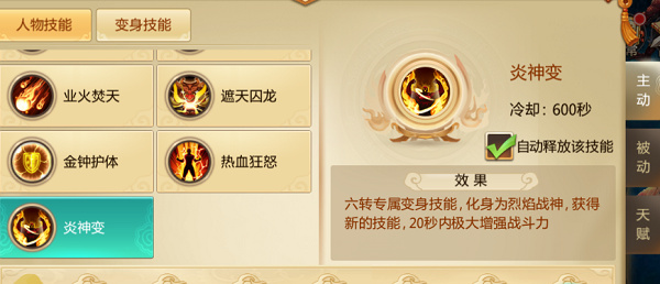 六转后增加人物主动技能“炎神变”,使用后化身烈焰战神,改变外观,人物所有主动技能替换为强大的变身技能,在变身持续时间无法使用人物技能,只能使用变身技能,变身技能初始为3个,剩余的3个天赋需要在神通天赋点亮后才可使用。