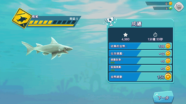 4、挑战50个专属任务,探寻深海隐藏宝物!收集任务奖励的金币与宝石,可用于升级鲨鱼属性,也能兑换强力特殊救生道具。