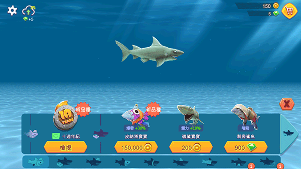 5、逐步解锁更多水下凶猛巨兽!迅捷的灰鲭鲨、怪异的锤头鲨、强悍的虎鲨,所向披靡的无敌大白鲨,逐一收入麾下!