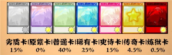 5、卡牌品质从低到高为劣质卡(15%)、原紫卡(0%)、普通卡(40%)、稀有卡(25%)、史诗卡(15%)、传奇卡(4.5%)、炼狱卡(0.5%)。