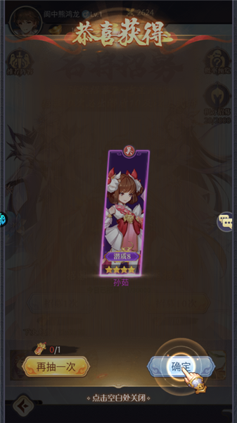 5、第一抽抽到了SR卡孙茹,东吴势力,点击确定退出召唤界面。