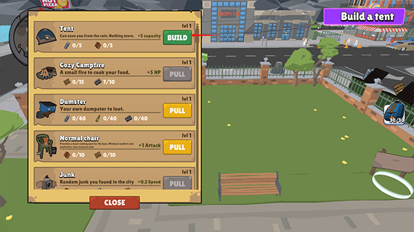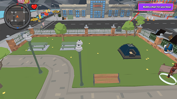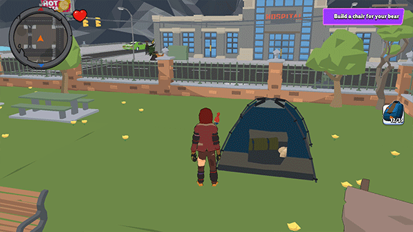 3、对话内容是需要玩家去建立自己的庇护所,前往公园处的公告牌可以建设各种生活物品,帐篷、凳子、火堆、摩托车等等