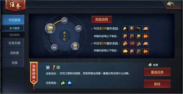 首先映入眼帘的是今日目标,今日目标中包括关卡悬赏和竞技悬赏,这些都是一些每日任务。在关卡悬赏中,还有特殊的跑环任务,不仅能领取每个环的奖励,完成第3环与第5环还能获得额外得奖励,ps:神兵值越高,能获得的奖励也越赞!
