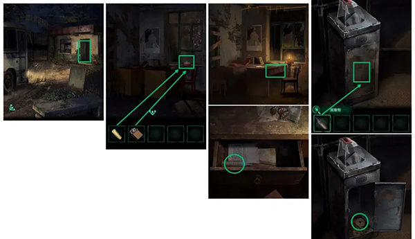 6、进入值班室,将【蜡烛】放在烛台上,用【打火机】点燃蜡烛。点击桌子的抽屉,打开抽屉拿到【润滑剂】,用【润滑剂】打开钱箱的柜门,拿到【纸钱】。