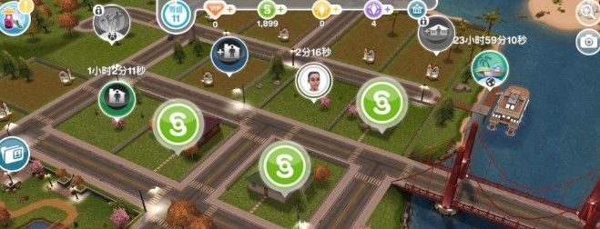 二、 来自解锁建筑物的模拟硬币每隔一段时间,当玩家打开城镇地图时,就会看到地图上解锁的建筑物顶部出现模拟货币奖励,点击即可领取。这些建筑物不仅包括市民的住宅,还包括公园和商店等建筑物。即使里面没有公民,他们仍然会获得奖励。