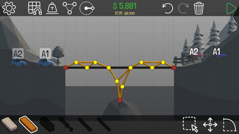 第一关,首先连接好道路,选择木板,在桥桥面以下建造桥梁框架,只要不超过预算即可轻松过关。